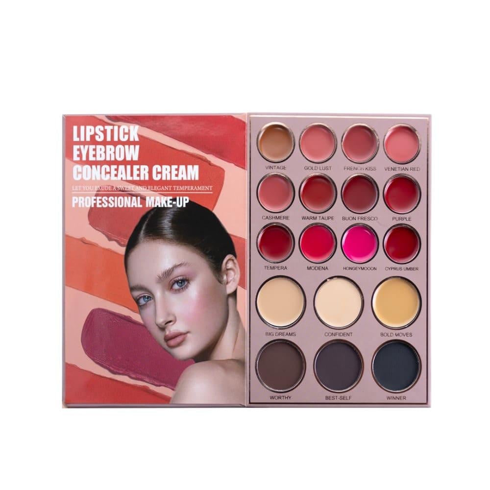- 3 الوان من كونسيلر : يخفي هالات العين وعيوب البشرة ويوحد لونها بالإضافة إلى ملئ خطوط التجاعيد الدقيقة.