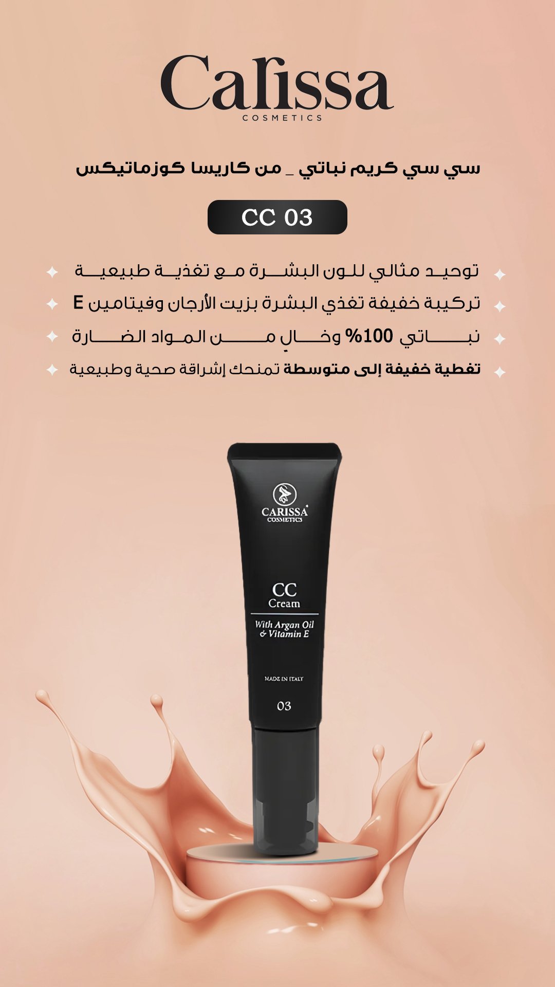 - احظي بمكياج متألق وبتغذية عميقة تحتوي على فيتامين هـ وزيت الأرقان مع السي سي كريم هذا من كاريسا كوزماتيكس، بتركيبة خفيفة على خلاف الفاونديشن ولمسة نهائية طبيعية.