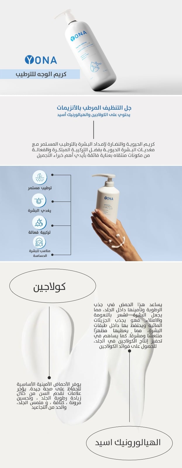 المكونات الرئيسية: الهيالورونيك، الكولاجين، الفيتامين E