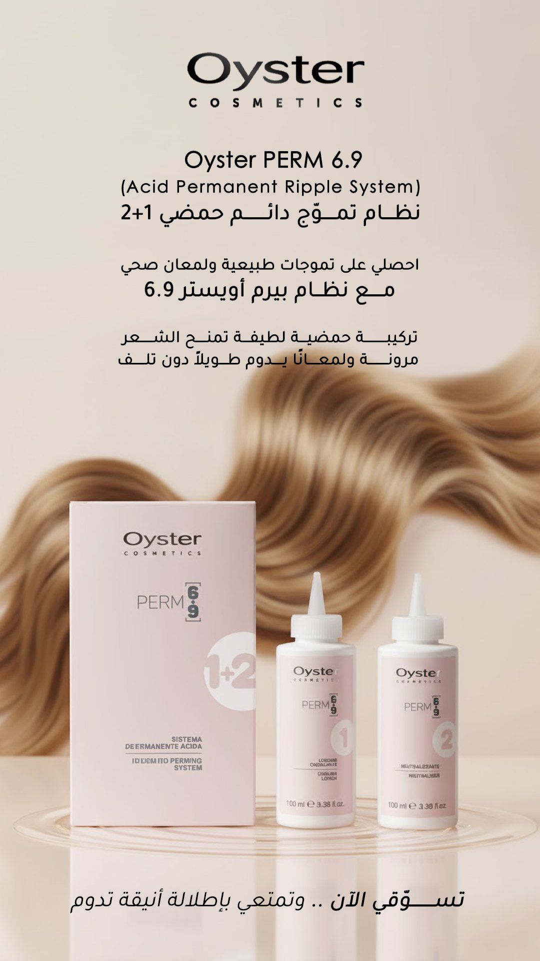 اكتشفي سر التجاعيد الطبيعية والمرنة مع نظام Oyster PERM 6.9 1+2 من Oyster Professional – تركيبة حمضية مبتكرة تعمل بدرجة pH = 6.9 لتمنحك تموجات جميلة وثابتة دون الإضرار بألياف الشعر.